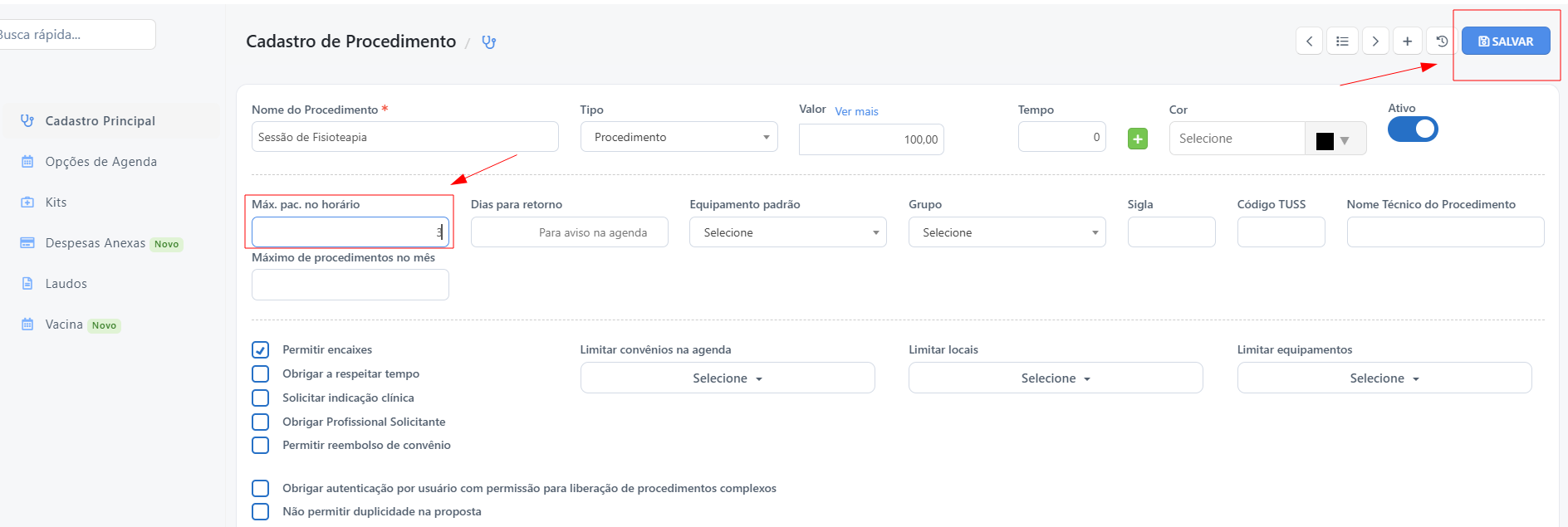 Após clicar em Editar o procedimento, defina o número máximo de pacientes por horário e clique em Salvar.
