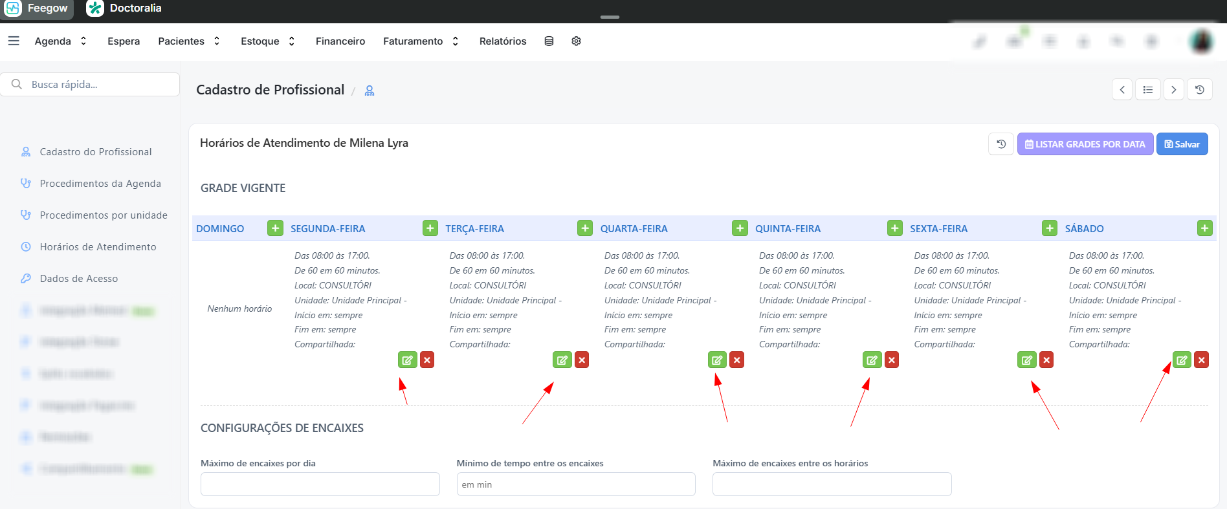 A grade com horário personalizado é utilizada quando o profissional realiza atendimentos simultâneos. Nela, é possível configurar horários repetidos, de acordo com a quantidade de pacientes que podem ser atendidos no mesmo horário.