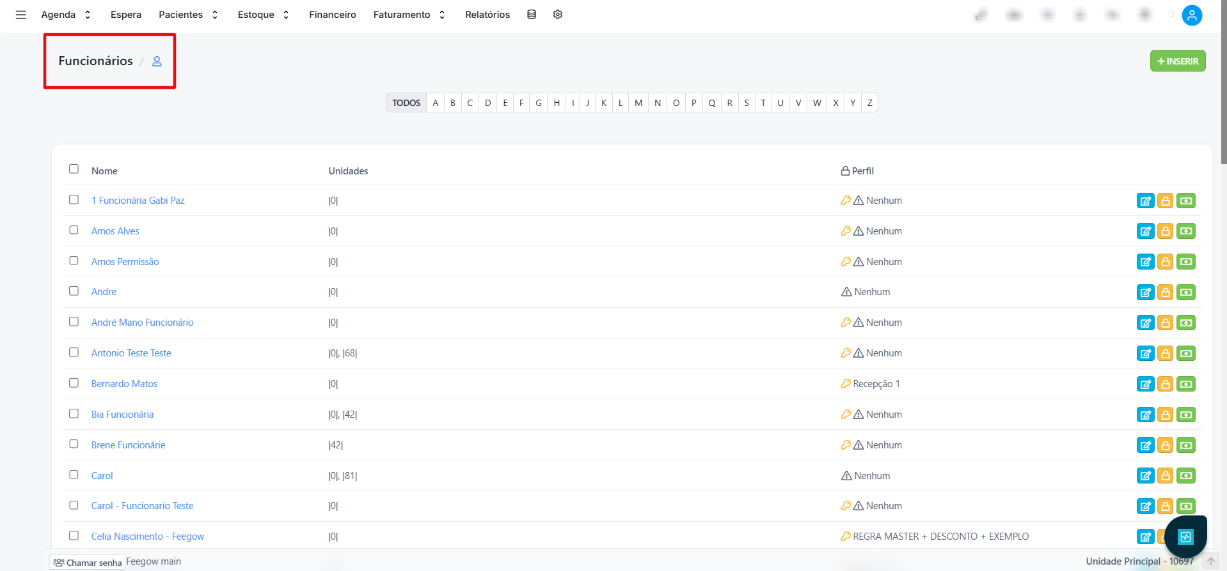 Neste exemplo, utilizaremos o cadastro de Funcionários. Ao acessar essa opção, será exibida a listagem de funcionários cadastrados. Em seguida, selecione o funcionário que deseja alterar as permissões.